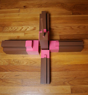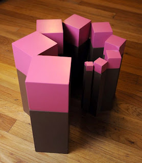 Looking back at the post, I was reminded how beautiful the Montessori materials are -- they are sublime in their beauty, simplicity, and sheer genius. We were inspired to make a new set of designs from scratch, and the girls welcomed the challenge (there are a few pics of the girls working on them here), even designing one of their own.